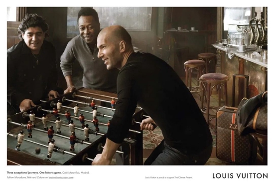LV在2010年邀请齐达内、马拉多纳和贝利出镜拍摄广告大片,同样由Annie Leibovitz拍摄