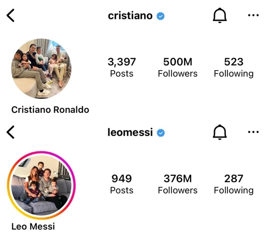 作为Instagram粉丝数量最多的两个人,C罗和梅西的影响力已经无人能匹敌