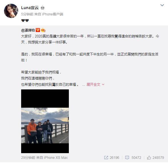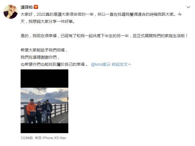 大喜的日子是也 发表于 2020-7-28 22:27 恭喜!潘玮柏晒全家福官宣结婚 妻子是曾传绯闻的空姐比男方小13岁 2020