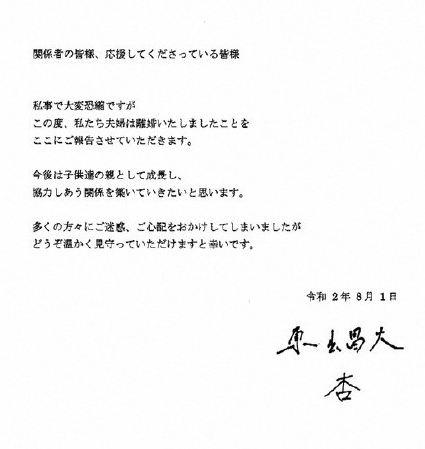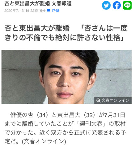 大喜的日子是也 发表于 2020-8-1 19:22 渡边杏、东出昌大正式发布离婚声明,今后将共同养育孩子 2020