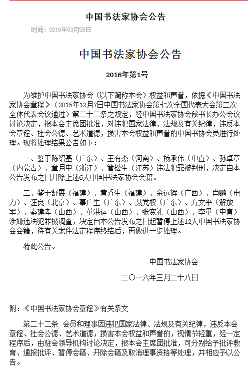 非首个 值得一提的是,热爱书法的官员落马,靳绥东并非第一个。 2016年3月,中国书法家协会发布公告,开除6名违法犯罪、损害协会声誉的会员会籍,对12名涉嫌违法犯罪被调查者暂停会籍。 政知君注意到,被开除者当中至少有3名官员,其中两名原省部级官员分别在2010年和2007年被判处死缓。