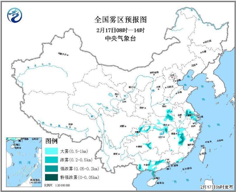 图1 全国雾区预报图(17日08时-14时) 未来具体预报: 17日08时至18日08时,新疆伊犁河谷及沿天山附近、青藏高原中东部、宁夏、陕西中部、山西中南部、河北南部等地的部分地区有小到中雪或雨夹雪;黄淮西部、江淮西部和南部、江南中北部、西南地区东部等地的部分地区有小到中雨或阵雨。新疆北部、甘肃中部、内蒙古中西部等地有4~6级风(见图1)。